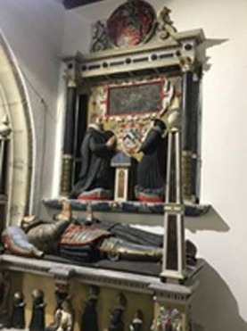 Close investigation of the sanctuary floor shows some tomb stones dedicated to some of the children. Touchingly, some of these request prayers were for the souls of the departed child, an unusual departure for a family who would have officially embraced the reform tradition. Praying for the departed would very much have been seen as a practice associated associated with the old religion.